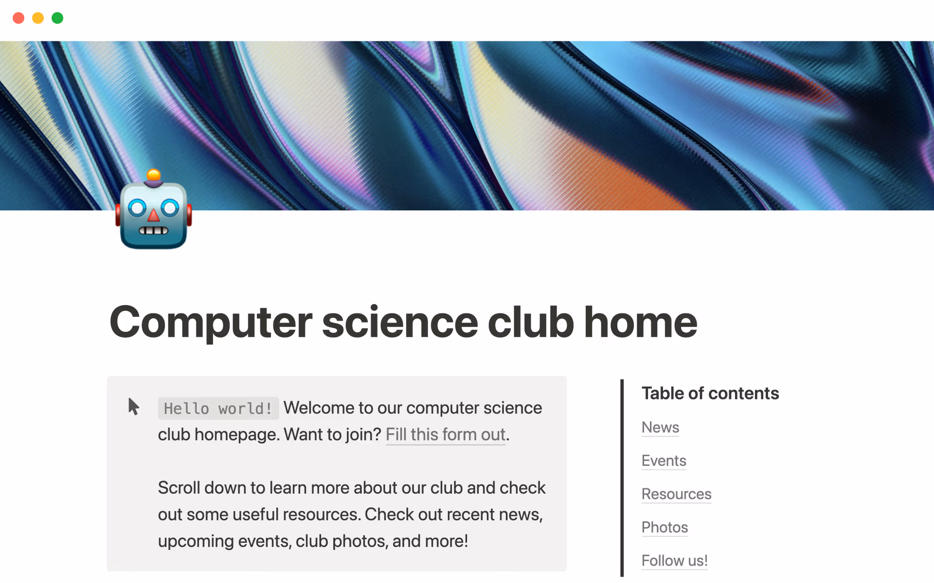 School isn't just about school these days — if you're running a club or managing a group project, this template can help you capture all of your team's knowledge. You can keep your mission statement, tasks, and sponsorship apps neatly organized in this homepage. Share it with current and future team members so they can find everything they need to push projects forward.